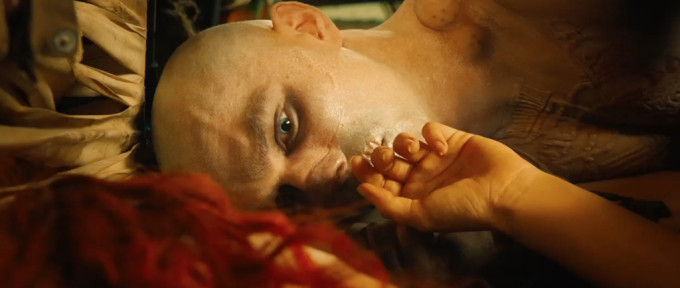 Max Rockatansky is the titular character of the film. In the very first minutes of the film he established himself as a survivor living on a day-to-day basis. He has lost everyone that he cared about, and as a result he has been reduced to nothing more than an embodiment of the will to live. He is not living for a goal, and ambition, or a person. All he has is his freedom and the will to survive. However, his freedom is taken from him as he is violently kidnapped by a band of War Boys, Immortan Joe’s personal brainwashed army. In their captivity Max is bound and caged. As kettle he is branded as Joe’s property. His back is permanently marked with information about his body and blood type, like the description of contents you can find on most wares in a grocery store. Like an animal in captivity he is forced to wear a steel muzzle. The War Boys have not only robbed him of his freedom, they are also taking away his worth as a human being. To them he is an object they own. He is their living blood-bag that they can put needles into in order to refill their own supplies as they see fit. Max has no control over his own body. It is used as a tool, ready to be discarded if he is no longer needed. This is further illustrated as he is later placed on the hood of a car like an ornament. He is still only there so that the War Boys can drain his blood as they are driving. With no regard to his safety he is bound with chains at the front of a car that races at high speed while bullets and projectiles are fired around him. If he dies, it is of no consequence. There are more blood-bags where he came from anyway.